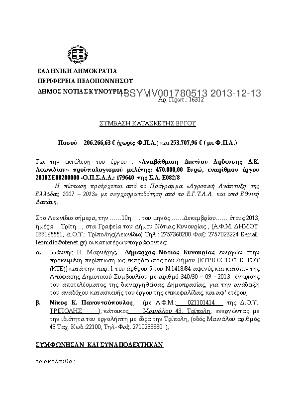 7. Σύμβαση κατασκευής έργου : Αναβάθμιση Δικτύου Άρδευσης Δ.Κ. Λεωνιδίου