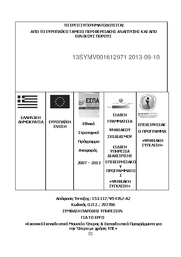2. «Εικονικό Εκπαιδευτικό Μουσείο Όπερας & Εκπαιδευτικά Προγράμματα για την Όπερα με χρήση ΤΠΕ», το οποίο εντάσσεται στο έργο «Αξιοποίηση σύγχρονων συστημάτων και τεχνολογιών για την παροχή νέων καινοτόμων ψηφιακών υπηρεσιών από το χώρο της...