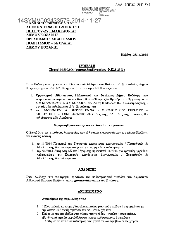 7. Συντήρηση πρασίνου ποδοσφαιρικού γηπέδου Δημοτικ Αθλητικού Κέντρου για το διάστημα 01/12/14-30/11/15