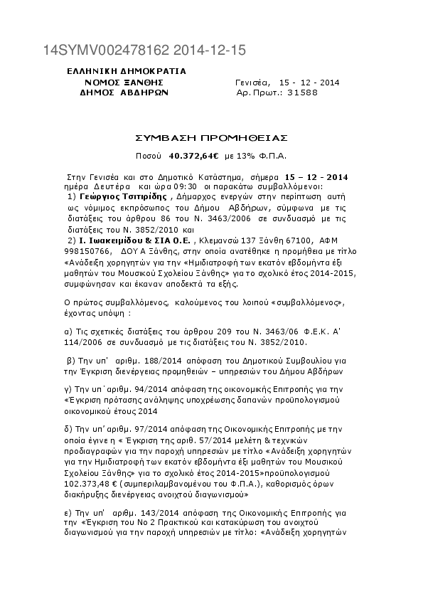 8. ΣΥΜΒΑΣΗ ΓΙΑ ΤΗΝ Ανάδειξη χορηγητών για την «Ημιδιατροφή των 176 μαθητών του Μουσικού Σχολειου