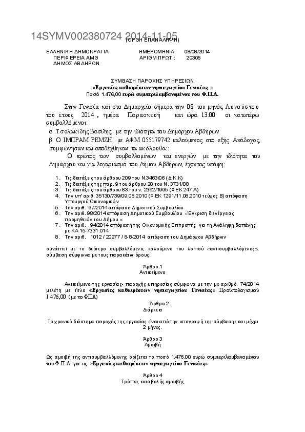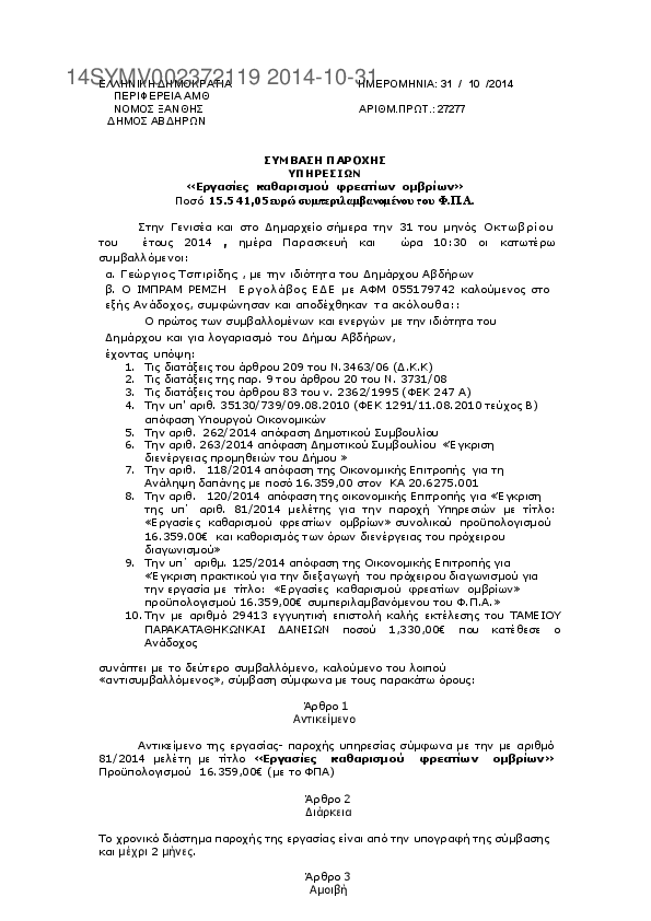 1. ΣΥΜΒΑΣΗ ΠΑΡΟΧΗΣ ΥΠΗΡΕΣΙΩΝ «Εργασίες καθαρισμού φρεατίων ομβρίων»