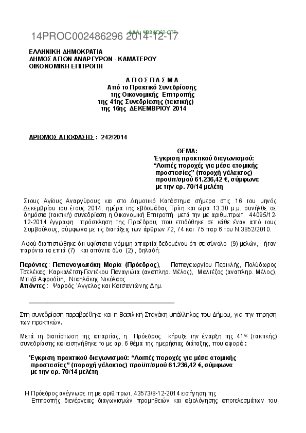 7. 'Εγκριση πρακτικού διαγωνισμού: “Λοιπές παροχές για μέσα ατομικής προστασίας” (παροχή γάλακτος) προϋπ/σμού 61.236,42 €, σύμφωνα με την αρ. 70/14 μελέτη