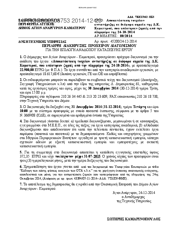 8. Εγκριση όρων Διακήρυξης Δημοπρασίας για το έργο:ΑΠΟΚΑΤΑΣΤΑΣΗ ΤΟΙΧΕΙΩΝ ΑΝΤΙΣΤΗΡΙΞΗΣ ΣΕ ΔΙΑΦΟΡΑ ΣΗΜΕΙΑ ΤΗΣ Δ.Κ.ΚΑΜΑΤΕΡΟΥ, ΠΟΥ ΥΠΕΣΤΗΣΑΝ ΖΗΜΙΕΣ ΑΠΟ ΤΗΝ ΠΛΗΜΜΥΡΑ ΤΗΣ 24/10/2014(A.M.80/14).