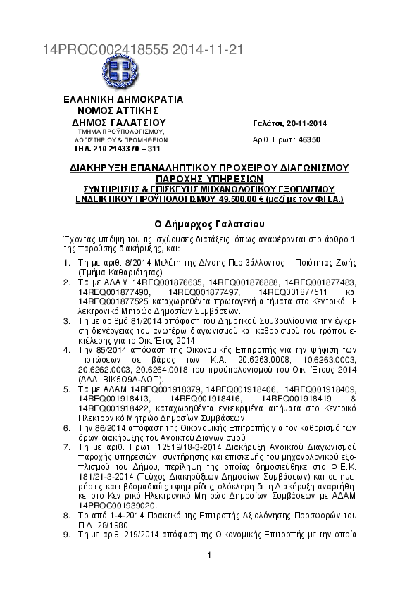 1. ΕΠΑΝΑΛΗΠΤΙΚΟΣ ΠΡΟΧΕΙΡΟΣ ΔΙΑΓΩΝΙΣΜΟΣ ΣΥΝΤΗΡΗΣΗΣ & ΕΠΙΣΚΕΥΗΣ ΜΗΧΑΝΟΛΟΓΙΚΟΥ ΕΞΟΠΛΙΣΜΟΥ