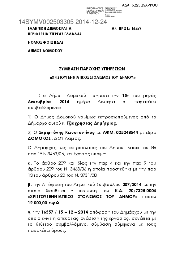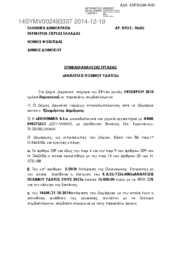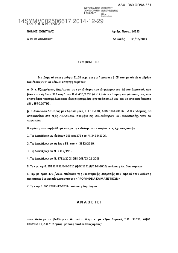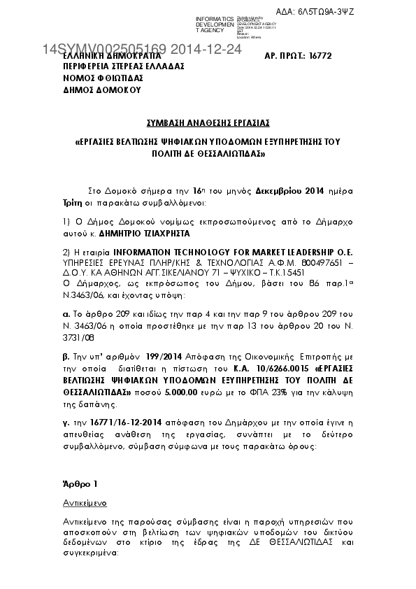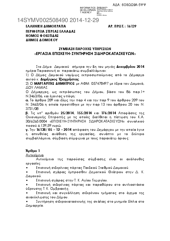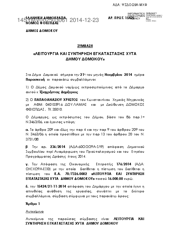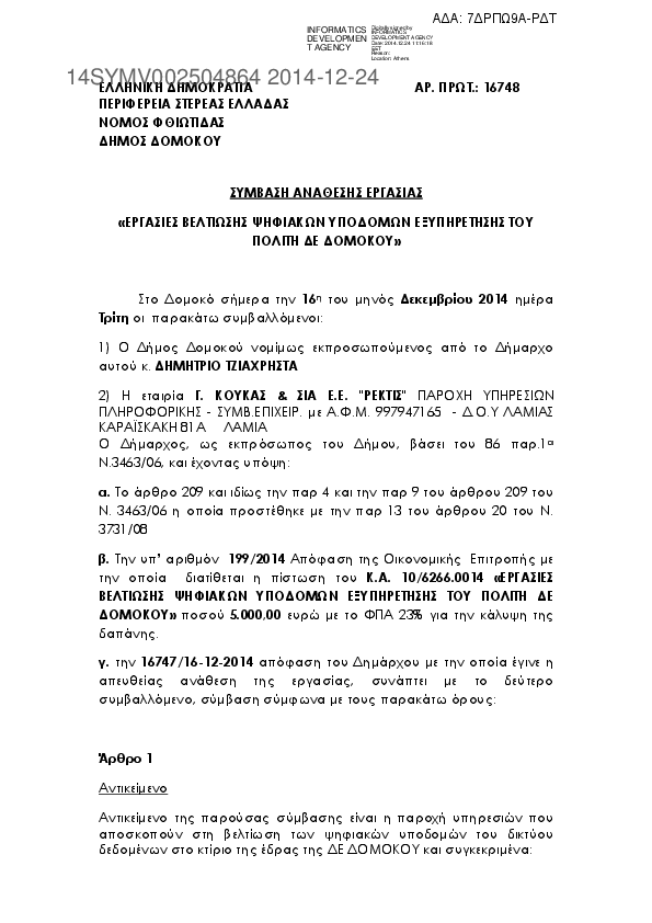 7. ΠΑΡΟΧΗ ΤΗΣ ΕΡΓΑΣΙΑΣ ΛΕΙΤΟΥΡΓΙΑ ΚΑΙ ΣΥΝΤΗΡΗΣΗ ΕΓΚΑΤΑΣΤΑΣΗΣ ΧΥΤΑ ΔΗΜΟΥ ΔΟΜΟΚΟΥ