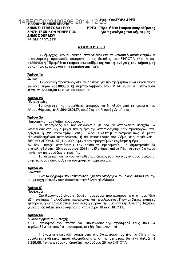 9. ΑΠΟΣΤΟΛΗ ΔΙΑΚΗΡΥΞΗΣ ΔΗΜΑΧΟΥ ΓΙΑ ΤΗΝ ΠΡΟΜΗΘΕΙΑ ΕΤΟΙΜΟΥ ΣΚΥΡΟΔΕΜΑΤΟΣ ΓΙΑ ΤΙΣ ΑΝΑΓΚΕΣ ΤΟΥ ΔΗΜΟΥ ΜΑΣ ΕΤΟΥΣ 2015