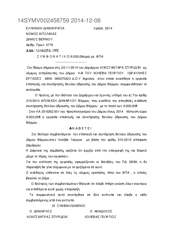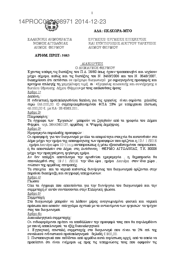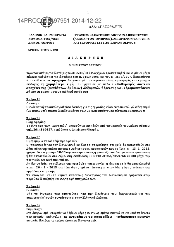 7. ΑΠΟΣΤΟΛΗ ΔΙΑΚΗΡΥΞΗΣ ΔΗΜΑΡΧΟΥ ΓΙΑ ΔΗΜΟΠΡΑΣΙΑ ΕΠΙΚΣΕΥΗ ΚΑΙ ΣΥΝΤΗΡΗΣΗ ΔΙΚΤΥΟΥ ΥΔΡΕΥΣΗΣ ΔΗΜΟΥ ΘΕΡΜΟΥ