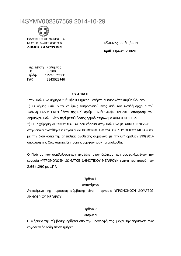 2. Παροχή της Υπηρεσίας "Υγρομόνωση Δώματος Δημοτικού Μεγάρου"