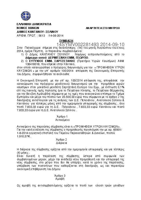 7. ΣΥΜΒΑΣΗ ΓΙΑ ΤΗΝ ΠΡΟΜΗΘΕΙΑ ΚΑΥΣΙΜΩΝ ΚΑΙ ΛΙΠΑΝΤΙΚΩΝ ΓΙΑ ΤΙΣ Δ.Ε. ΚΑΝΤΑΝΟΥ & ΠΕΛΕΚΑΝΟΥ