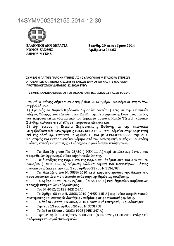 10. ΣΥΜΒΑΣΗ ΓΙΑ ΤΗΝ ΠΑΡΟΧΗ ΥΠΗΡΕΣΙΑΣ « ΣΥΛΛΟΓΗ ΚΑΙ ΜΕΤΑΦΟΡΑ ΣΤΕΡΕΩΝ ΑΠΟΒΛΗΤΩΝ ΚΑΙ ΑΝΑΚΥΚΛΩΣΙΜΩΝ ΥΛΙΚΩΝ Δ