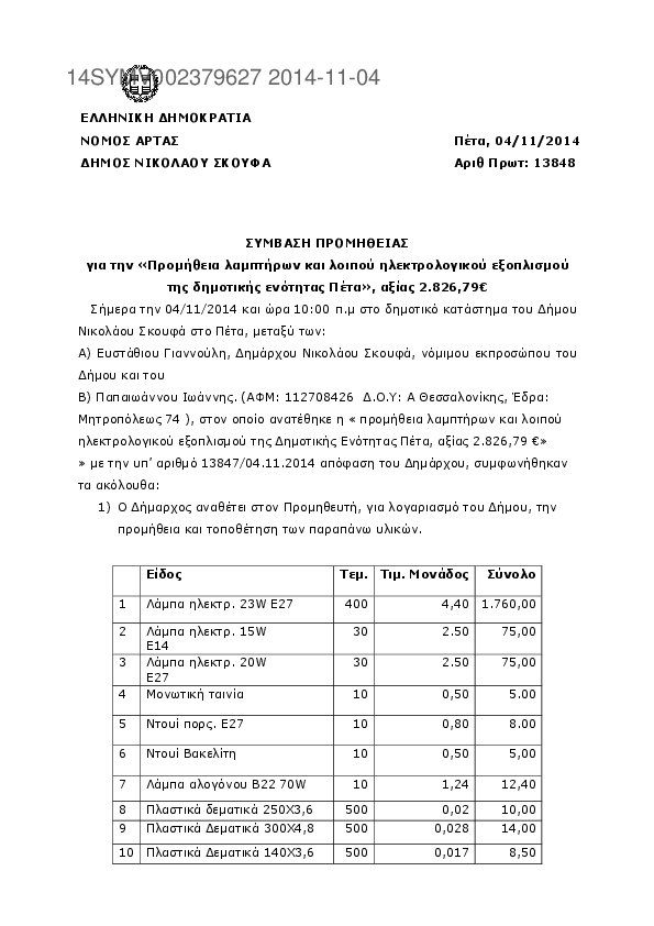 1. ΠΡΟΜΗΘΕΙΑ ΗΛΕΚΤΡΟΛΟΓΙΚΟΥ ΥΛΙΚΟΥ ΚΑΙ ΛΑΜΠΤΗΡΩΝ Δ.Ε ΠΕΤΑ