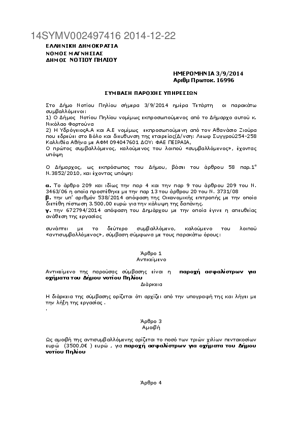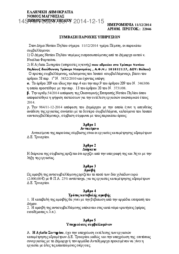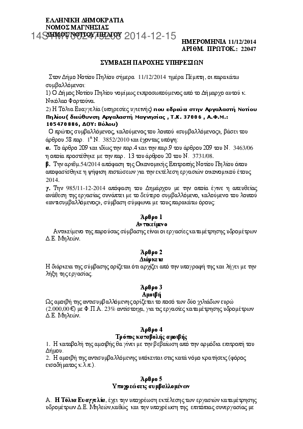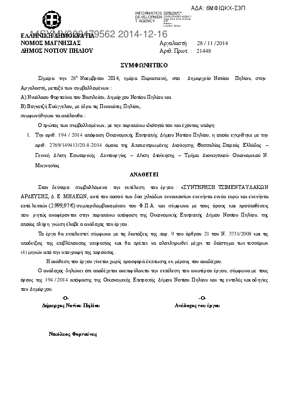 5. Συμφωνητικό για την εκτέλεση του έργου: "Συντήρηση τσιμενταυλάκων άρδευσης , Δ.Ε. Μηλεών