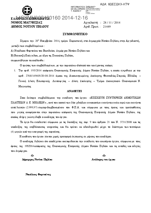 3. ΣΥΜΦΩΝΗΤΙΚΟ ΓΙΑ ΤΗΝ ΕΚΤΕΛΕΣΗ ΤΟΥ ΕΡΓΟΥ "ΕΠΙΣΚΕΥΗ ΣΥΝΤΗΡΗΣΗ ΔΗΜΟΤΙΚΩΝ ΠΛΑΤΕΙΩΝ Δ.Ε. ΜΗΛΕΩΝ"