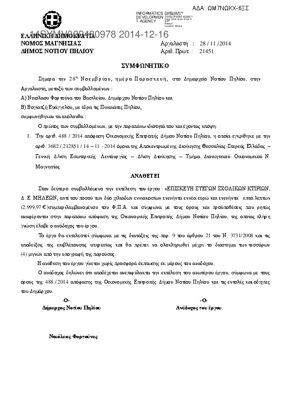 6. ΣΥΜΦΩΝΗΤΙΚΟ ΓΙΑ ΤΗΝ ΕΚΤΕΛΕΣΗ ΤΟΥ ΕΡΓΟΥ: "ΕΠΙΣΚΕΥΗ ΣΤΕΓΩΝ ΣΧΟΛΙΚΩΝ ΜΑΡΤΥΡΙΩΝ Δ.Ε. ΜΗΛΕΩΝ"