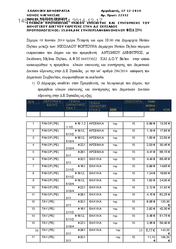 8. ΣΥΜΒΑΣΗ ΠΡΟΜΗΘΕΙΑΣ ΥΛΙΚΩΝ ΕΠΙΣΚΕΥΗΣ ΚΑΙ ΣΥΝΤΗΡΗΣΗΣ ΤΟΥ ΔΗΜΟΤΙΚΟΥ ΔΙΚΤΥΟΥ ΥΔΡΕΥΣΗΣ ΣΤΗΝ Δ.Ε ΣΗΠΙΑΔΟΣ