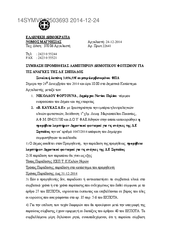 10. ΣΥΜΒΑΣΗ ΠΡΟΜΗΘΕΙΑΣ ΛΑΜΠΤΗΡΩΝ ΔΗΜΟΤΙΚΟΥ ΦΩΤΙΣΜΟΥ ΓΙΑ ΤΙΣ ΑΝΑΓΚΕΣ ΤΗΣ Δ.Ε ΣΗΠΙΑΔΟΣ