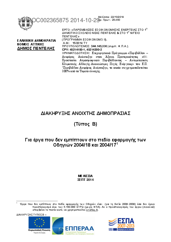 1. ΔΙΑΚΗΡΥΞΗ ΕΡΓΟΥ: ΠΑΡΕΜΒΑΣΕΙΣ ΕΞΟΙΚΟΝΟΜΗΣΗΣ ΕΝΕΡΓΕΙΑΣ ΣΤΟ 1ο ΔΗΜΟΤΙΚΟ ΣΧΟΛΕΙΟ Ν. ΠΕΝΤΕΛΗΣ ΚΑΙ ΣΤΟ 1ο