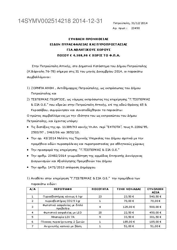 9. ΣΥΜΒΑΣΗ ΠΡΟΜΗΘΕΙΑΣ ΕΙΔΩΝ ΠΥΡΑΣΦΑΛΕΙΑΣ ΚΑΙ ΠΥΡΟΠΡΟΣΤΑΣΙΑΣ ΓΙΑ ΑΘΛΗΤΙΚΟΥΣ ΧΩΡΟΥΣ