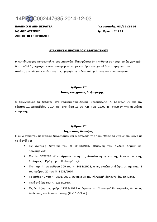 2. ΔΙΑΚΗΡΥΞΗ ΓΙΑ ΤΗΝ ΠΡΟΜΗΘΕΙΑ ΕΙΔΩΝ ΚΑΘΑΡΙΟΤΗΤΑΣ ΚΑΙ ΕΥΠΡΕΠΙΣΜΟΥ