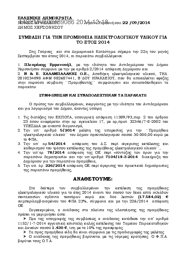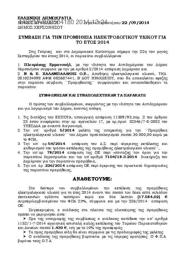 7. ΠΡΟΜΗΘΕΙΑ ΗΛΕΚΤΡΟΛΟΓΙΚΟΥ ΥΛΙΚΟΥ ΓΙΑ ΤΟ ΕΤΟΣ 2014