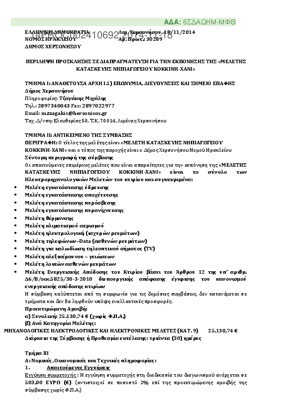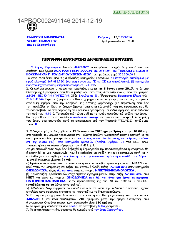 9. Περιληπτική και αναλυτική διακήρυξη για το έργο ανάπλαση περιβάλλοντα χώρου στην παιδική εξοχή Κοκκίνι Χάνι του Δήμου Χερσονήσου