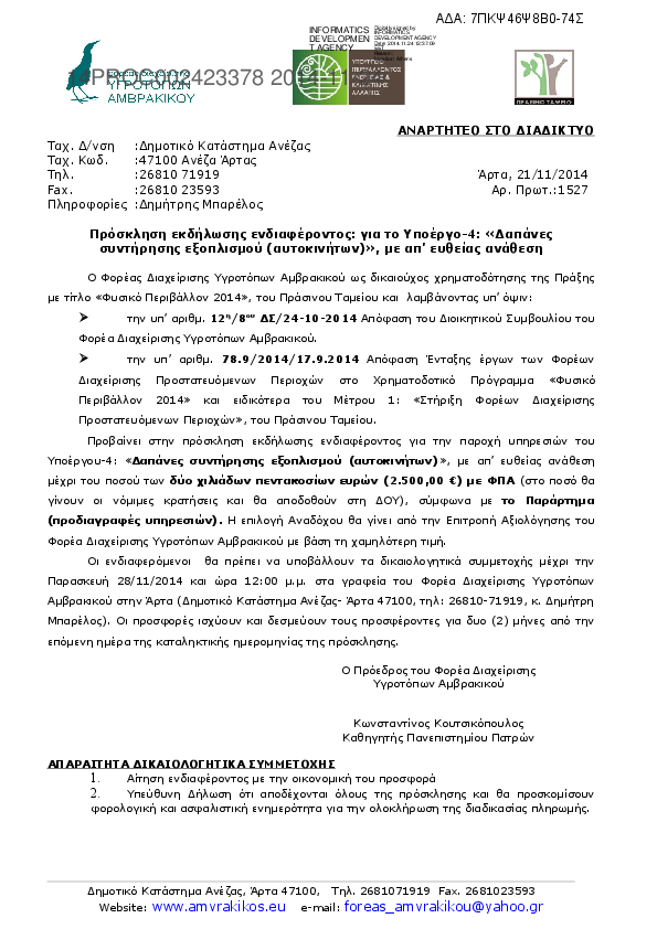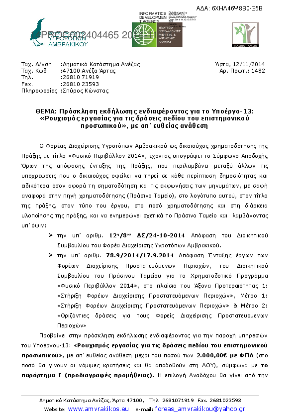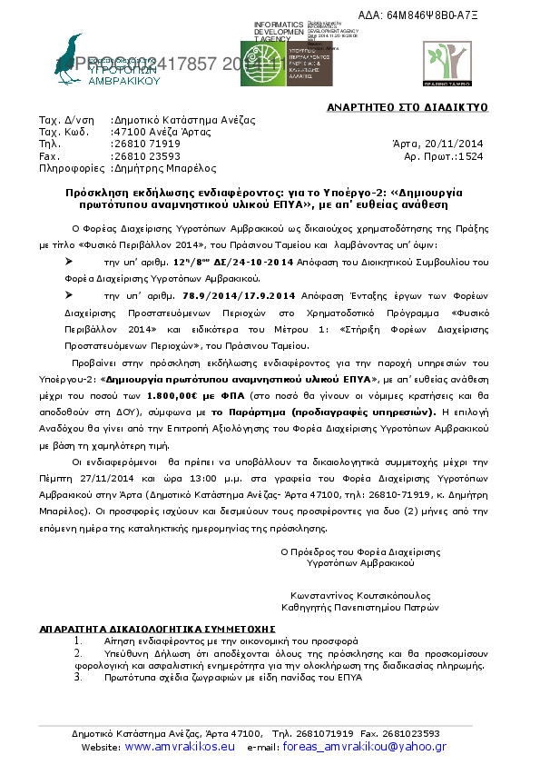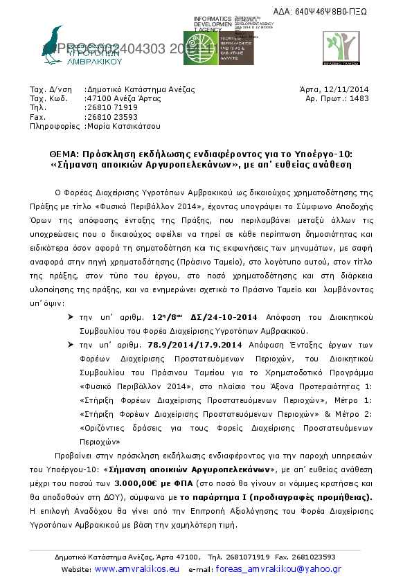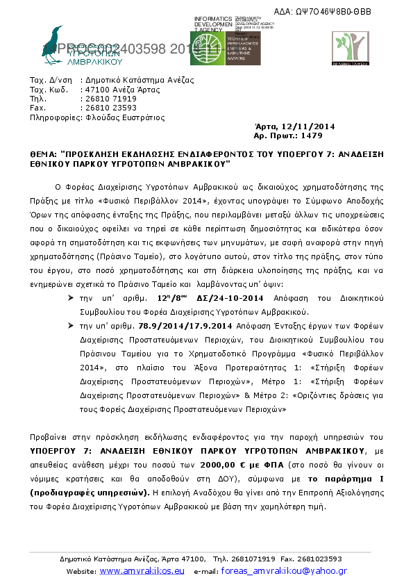 4. ΠΡΟΣΚΛΗΣΗ ΕΚΔΗΛΩΣΗΣ ΕΝΔΙΑΦΕΡΟΝΤΟΣ ΤΟΥ ΥΠΟΕΡΓΟΥ 7: ΑΝΑΔΕΙΞΗ ΕΘΝΙΚΟΥ ΠΑΡΚΟΥ ΥΓΡΟΤΟΠΩΝ ΑΜΒΡΑΚΙΚΟΥ