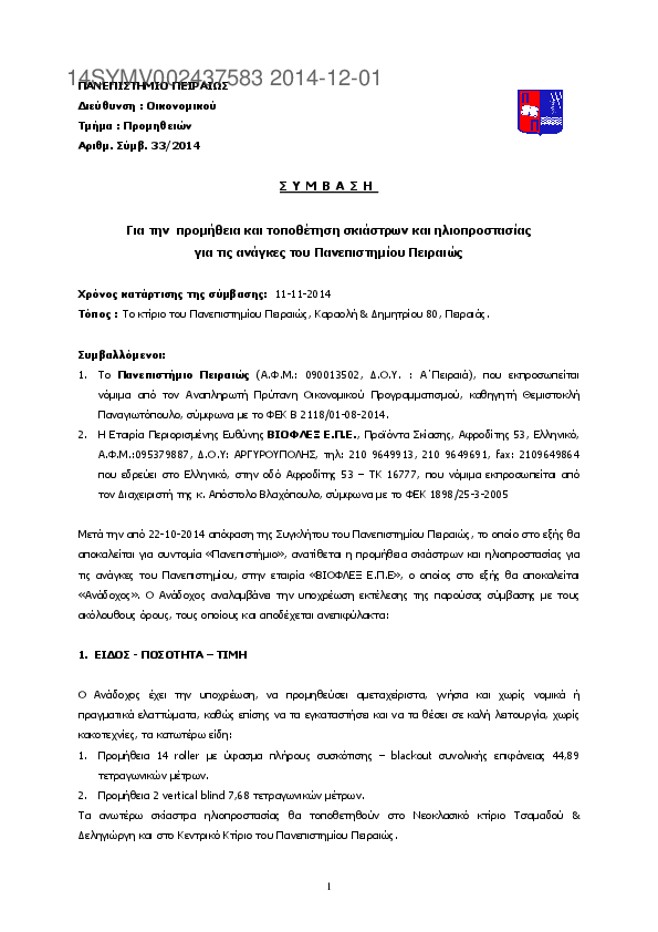 5. Προμήθεια & τοποθέτηση σκιάστρων και ηλιοπροστασίας για τις ανάγκες του Παν/μίου Πειραιώς