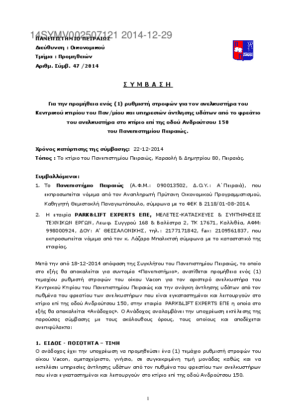9. Προμήθεια ενός ρυθμιστή στροφών και εργασίες άντλησης υδάτων (Παν/μιο Πειραιώς)
