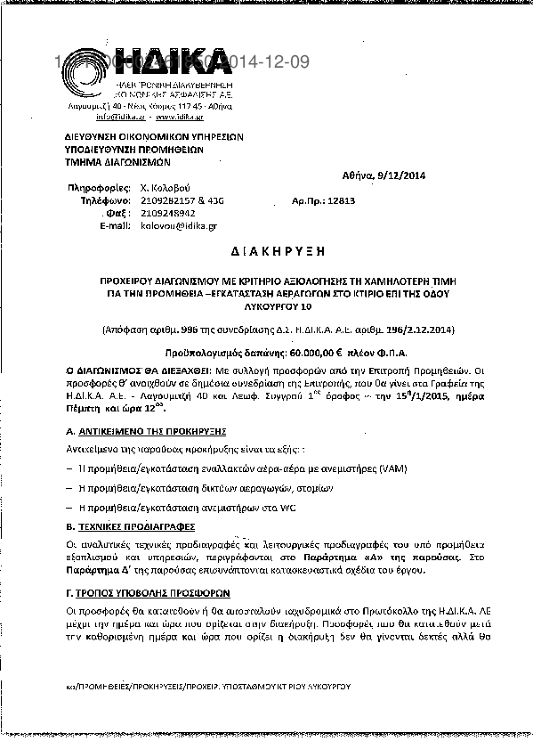 4. ΠΡΟΧΕΙΡΟΣ ΔΙΑΓΩΝΙΣΜΟΣ ΓΙΑ ΤΗΝ ΠΡΟΜΗΘΕΙΑ-ΕΓΚΑΤΑΣΤΑΣΗ ΑΕΡΑΓΑΓΩΓΩΝ ΣΤΟ ΚΤΙΡΙΟ ΛΥΚΟΥΡΓΟΥ 10
