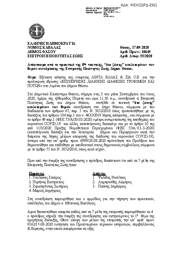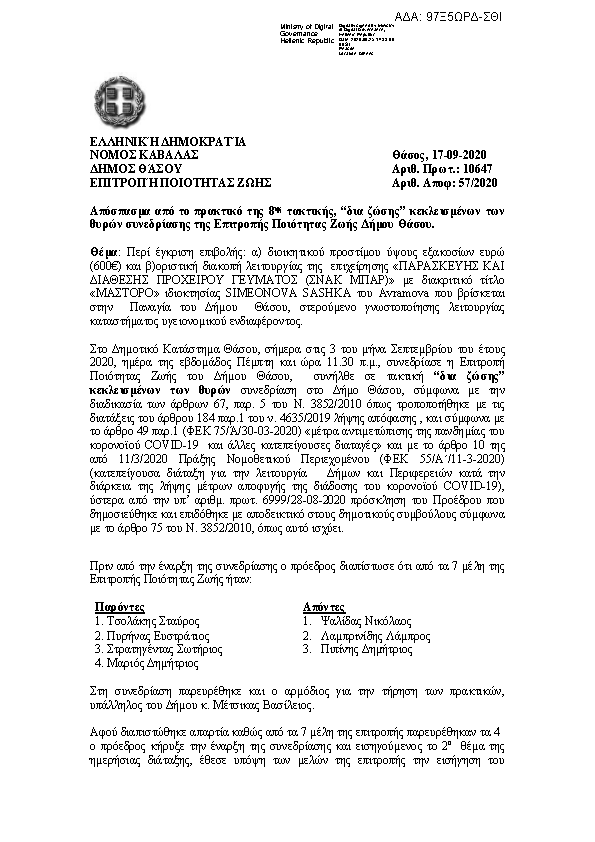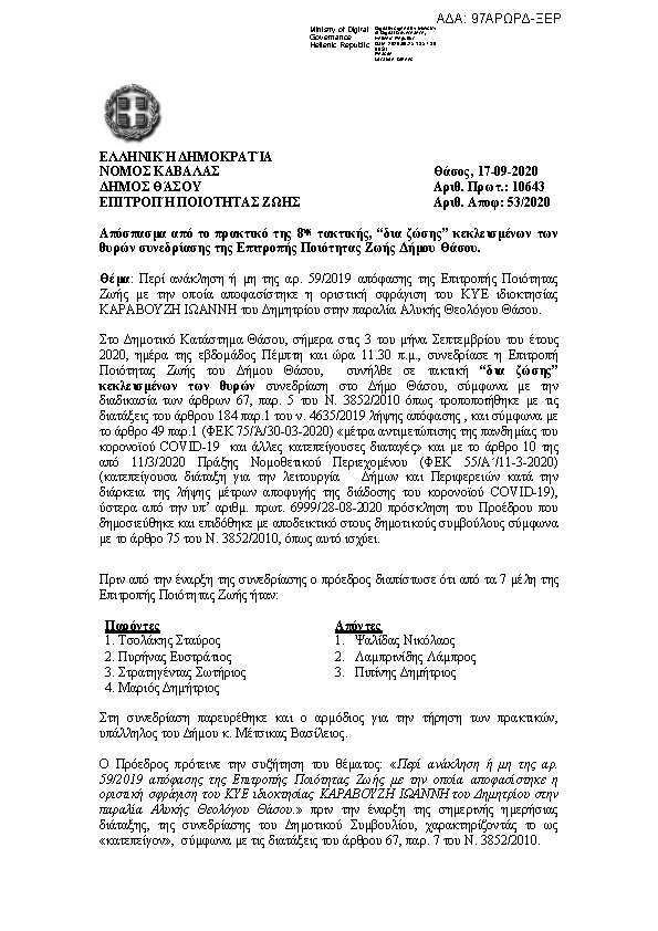 8. Περί ανάκληση ή μη της αρ. 59/2019 απόφασης της Επιτροπής Ποιότητας Ζωής με την οποία αποφασίστηκε η οριστική σφράγιση του ΚΥΕ ιδιοκτησίας ΚΑΡΑΒΟΥΖΗ ΙΩΑΝΝΗ του Δημητρίου στην παραλία Αλυκής Θεολόγου Θάσου.