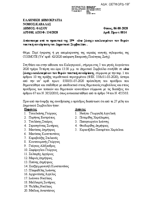 2. Περί έγκρισης ή μη απομάκρυνσης της κεραίας κινητής τηλεφωνίας της COSMOTE (Υπ’ αριθ. 42/2020 απόφαση Επιτροπής Ποιότητας Ζωής).