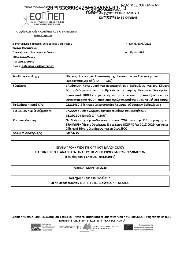 5. Κατακύρωση αποτελεσμάτων της διαδικασίας της πρόσκλησης εκδήλωσης ενδιαφέροντος με αρ. πρωτ 3186/19/2/2020 για την επιλογή αναδόχου για τη σύναψη (1) μιας σύμβασης μίσθωσης έργου για την παροχή του έργου «Μελέτη - Ανάπτυξη Εθνικού Πλαισί...
