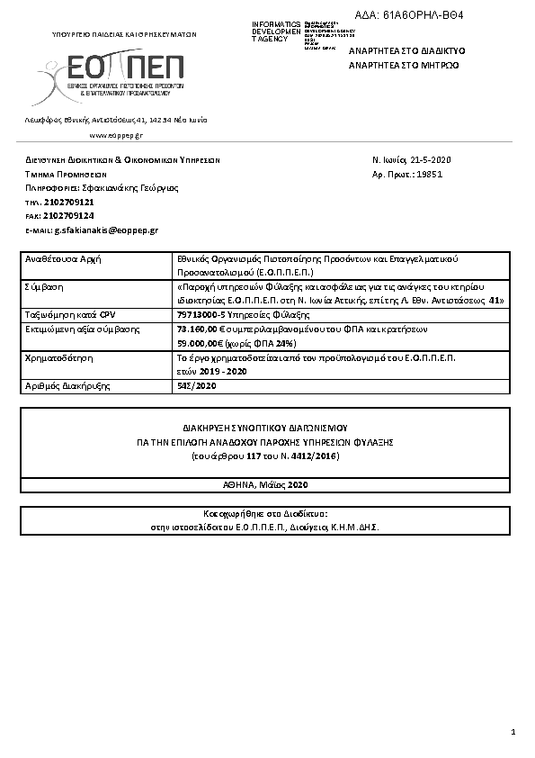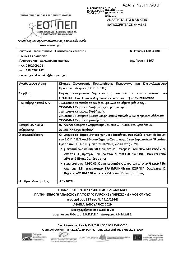 1. ΕΠΑΝΑΠΡΟΚΗΡΥΞΗ ΣΥΝΟΠΤΙΚΟΥ ΔΙΑΓΩΝΙΣΜΟΥ ΓΙΑ ΤΗΝ ΕΠΙΛΟΓΗ ΑΝΑΔΟΧΟΥ ΓΙΑ ΤΟ ΕΡΓΟ ΠΑΡΟΧΗΣ ΥΠΗΡΕΣΙΩΝ ΔΗΜΟΣΙΟΤΗΤΑΣ (του άρθρου 117 του Ν. 4412/2016)