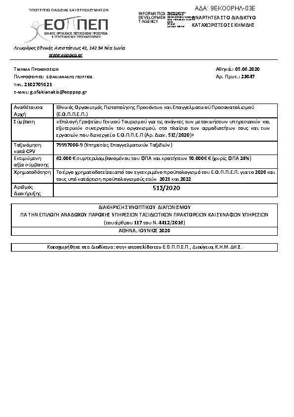 7. Επιλογή Γραφείου Γενικού Τουρισμού για τις ανάγκες των μετακινήσεων υπηρεσιακών και εξωτερικών συνεργατών του οργανισμού, στο πλαίσιο των αρμοδιότητά των τους και των εργασιών που διενεργεί ο Ε.Ο.Π.Π.Ε.Π (Αρ. Διακ. 51Σ/2020).