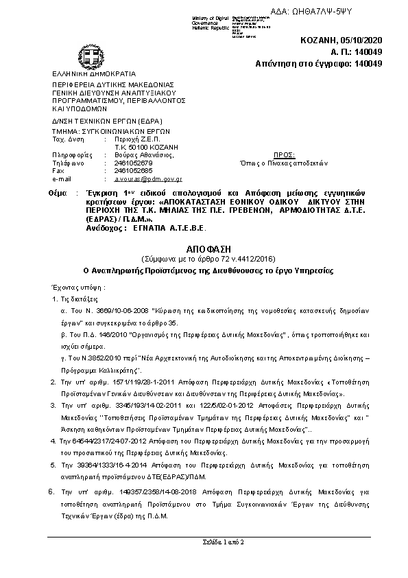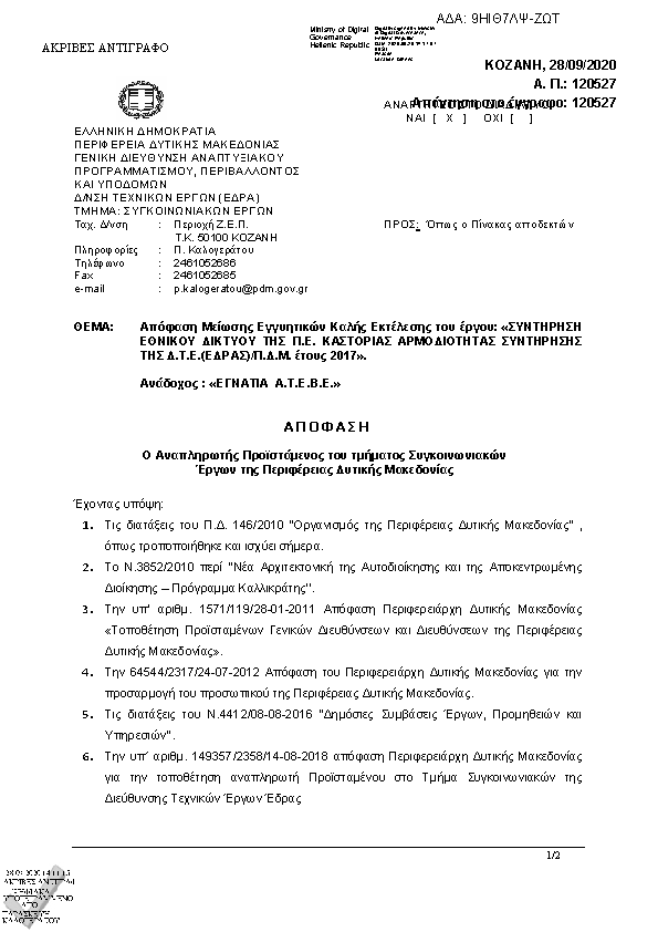 5. Απόφαση Μείωσης Εγγυητικών Καλής Εκτέλεσης του έργου: «ΣΥΝΤΗΡΗΣΗ ΕΘΝΙΚΟΥ ΔΙΚΤΥΟΥ ΤΗΣ Π.Ε. ΚΑΣΤΟΡΙΑΣ ΑΡΜΟΔΙΟΤΗΤΑΣ ΣΥΝΤΗΡΗΣΗΣ ΤΗΣ Δ.Τ.Ε.(ΕΔΡΑΣ)/Π.Δ.Μ. έτους 2017».
