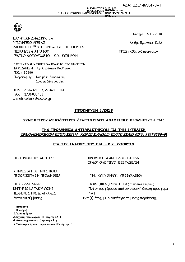 9. ΔΙΑΓΩΝΙΣΜΟΣ 05/2018 ΓΙΑ ΠΡΟΜΗΘΕΙΑ ΑΝΤΙΔΡΑΣΤΗΡΙΩΝ ΟΡΜΟΝΟΛΟΓΙΚΩΝ ΕΞΕΤΑΣΕΩΝ ΧΩΡΙΣ ΣΥΝΟΔΟ ΕΞΟΠΛΙΣΜΟ