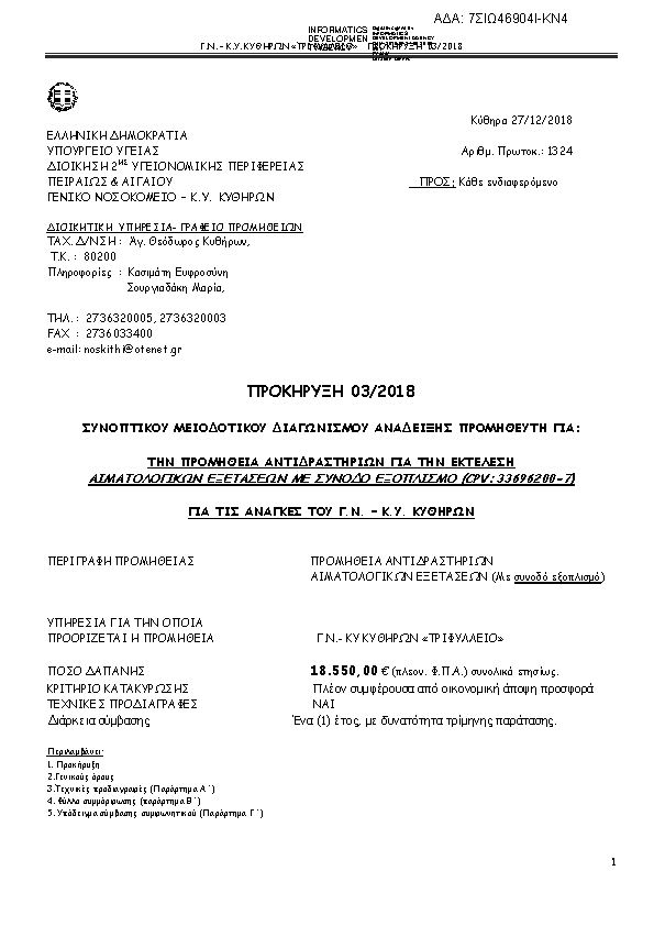 6. ΠΡΟΚΗΡΥΞΗ 03/2018 ΓΙΑ ΠΡΟΜΗΘΕΙΑ ΑΝΤΙΔΡΑΣΤΗΡΙΩΝ ΑΙΜΑΤΟΛΟΓΙΚΩΝ ΕΞΕΤΑΣΕΩΝ ΜΕ ΣΥΝΟΔΟ ΕΞΟΠΛΙΣΜΟ