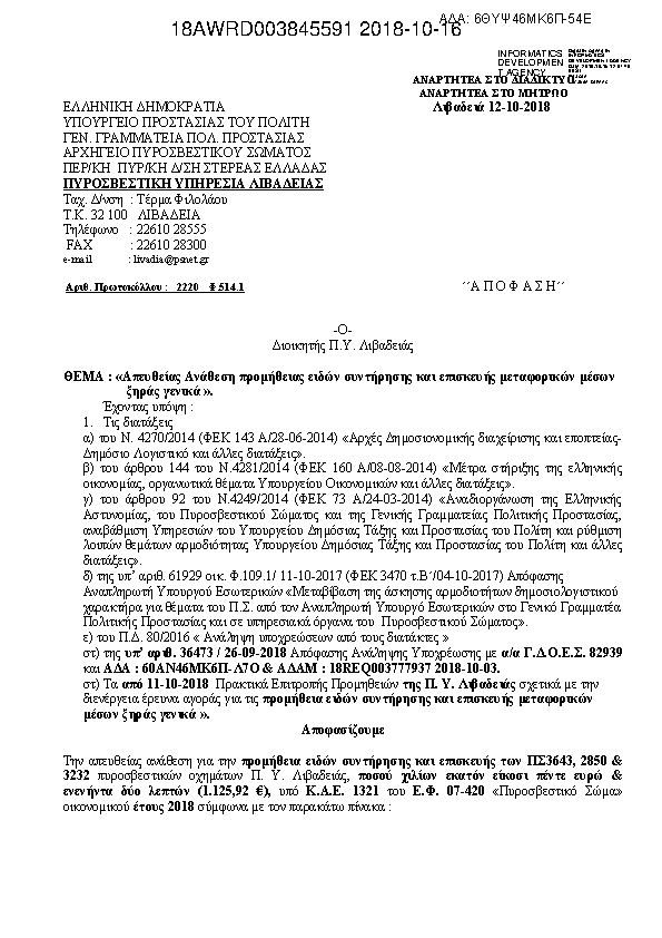 3. ΑΠΟΦΑΣΗ ΑΠΕΥΘΕΙΑΣ ΑΝΑΘΕΣΗΣ ΑΜΟΙΒΗΣ ΕΡΓΑΣΙΩΝ ΕΠΙΣΚΕΥΗΣ ΠΥΡ/ΚΩΝ ΟΧΗΜΑΤΩΝ Π.Υ. ΛΙΒΑΔΕΙΑΣ.