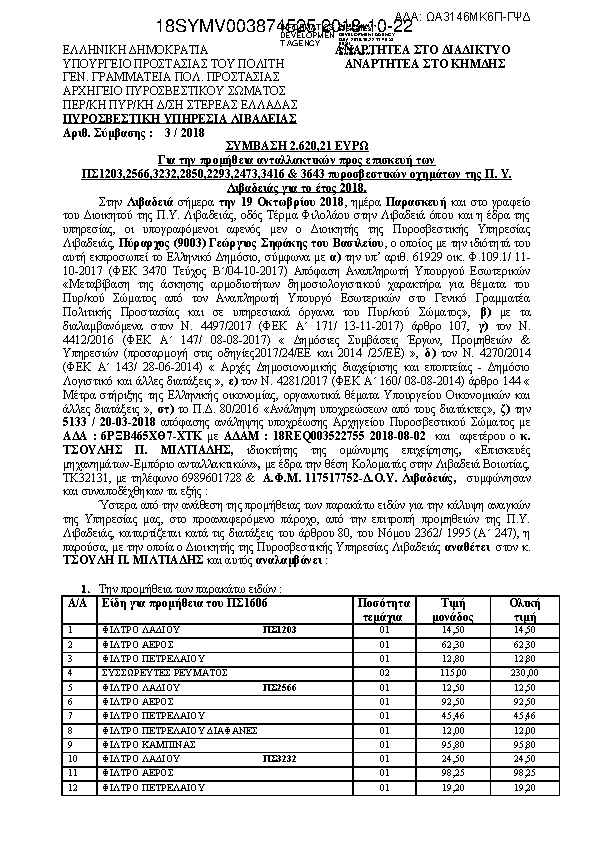 5. ΣΥΜΒΑΣΗ ΠΡΟΜΗΘΕΙΑ ΑΝΤΑΛΛΑΚΤΙΚΩΝ ΠΥΡ/ΚΩΝ ΟΧΗΜΑΤΩΝ Π.Υ. ΛΙΒΑΔΕΙΑΣ.