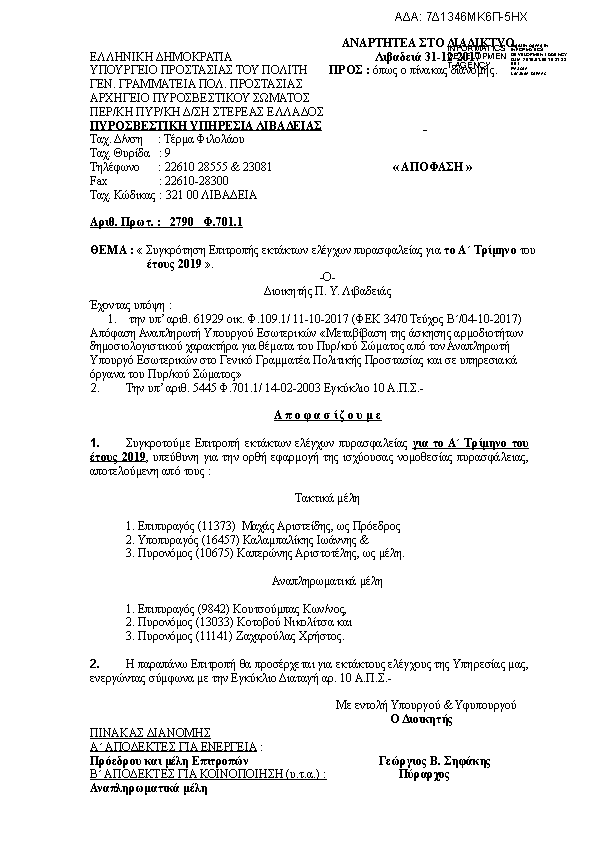 7. ΣΥΓΚΡΟΤΗΣΗ ΕΠΙΤΡΟΠΗΣ ΕΚΤΑΚΤΩΝ ΕΛΕΓΧΩΝ ΠΥΡΑΣΦΑΛΕΙΑΣ Α΄ ΤΡΙΜΗΝΟ 2019.