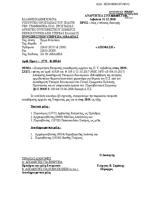 10. ΣΥΓΚΡΟΤΗΣΗ ΕΠΙΤΡΟΠΗΣ ΕΚΚΑΘΑΡΙΣΗΣ ΑΡΧΕΙΟΥ Π.Υ. ΛΙΒΑΔΕΙΑΣ ΕΤΟΥΣ 2019.