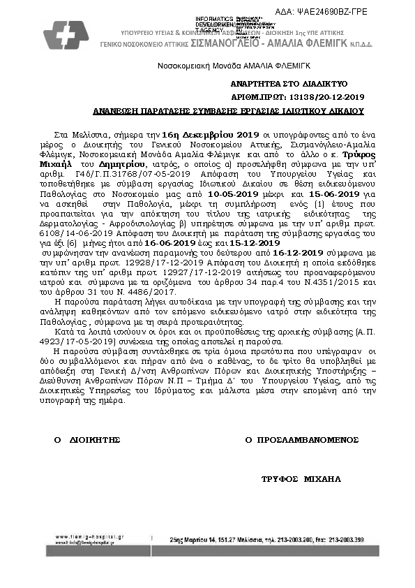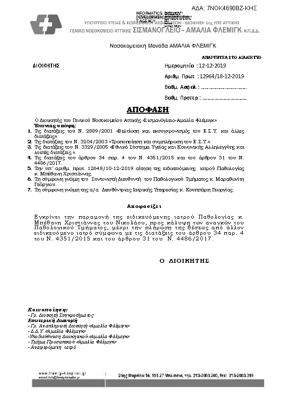 5. ΑΠΟΦΑΣΗ ΔΙΟΙΚΗΤΗ ΓΙΑ ΠΑΡΑΤΑΣΗ ΣΥΜΒΑΣΗΣ ΤΗΣ ΕΙΔΙΚΕΥΟΜΕΝΗΣ ΙΑΤΡΟΥ ΠΑΘΟΛΟΓΙΑΣ Κ. ΜΠΕΘΑΝΗ ΧΡΙΣΤΙΑΝΝΑΣ