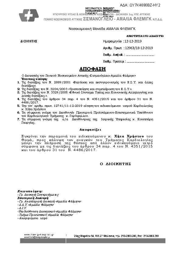 4. ΑΠΟΦΑΣΗ ΔΙΟΙΚΗΤΗ ΓΙΑ ΠΑΡΑΤΑΣΗ ΣΥΜΒΑΣΗΣ ΤΟΥ ΕΙΔΙΚΕΥΟΜΕΝΟΥ ΙΑΤΡΟΥ ΚΑΡΔΙΟΛΟΓΙΑΣ κ. ΧΗΤΑ ΧΡΗΣΤΟΥ