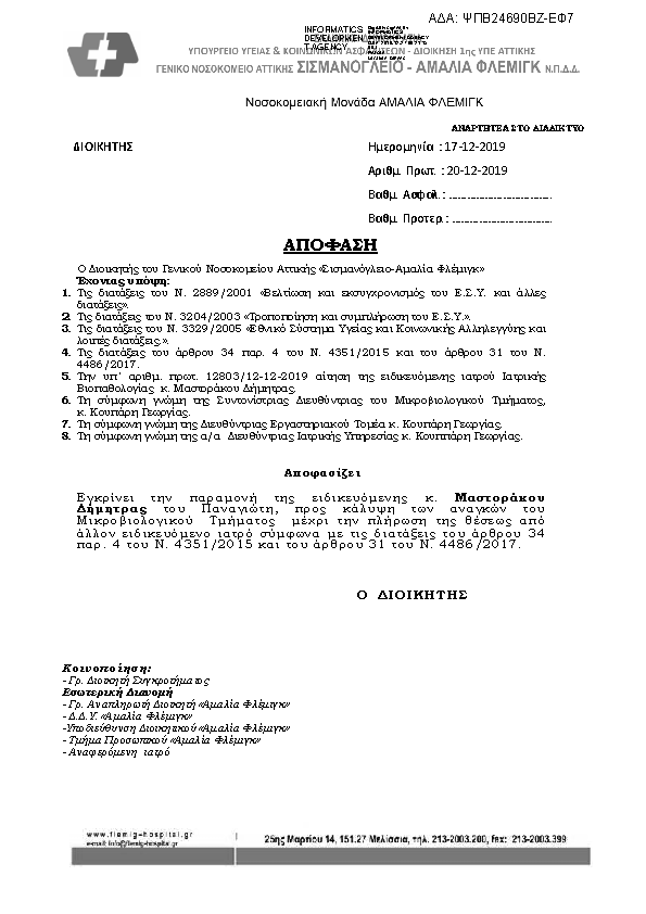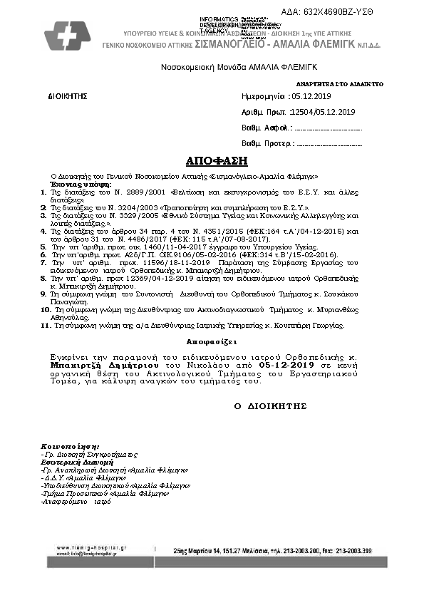 1. ΑΠΟΦΑΣΗ ΔΙΟΙΚΗΤΗ ΓΙΑ ΜΕΤΑΚΙΝΗΣΗ ΤΟΥ ΕΙΔΙΚΕΥΟΜΕΝΟΥ ΙΑΤΡΟΥ ΟΡΘΟΠΕΔΙΚΗΣ κ. ΜΠΑΚΙΡΤΖΗ ΣΕ ΚΕΝΗ ΘΕΣΗ ΤΟΥ ΑΚΤΙΝΟΔΙΑΓΝΩΣΤΙΚΟΥ ΤΜΗΜΑΤΟΣ ΤΟΥ ΕΡΓΑΣΤΗΡΙΑΚΟΥ ΤΟΜΕΑ